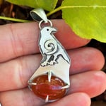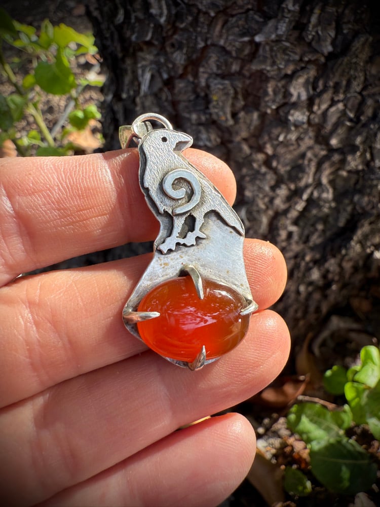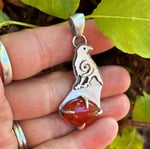 This pendant has a saw pierced raven with a claw encasing a carnelian cabochon stone. This is a one of a kind hand made .925 Sterling Silver pendant. The pendant sits about an 4 inches in length from bail to the end of the design. It was handcrafted and fabricated in my home work shop.